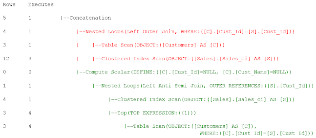 on C.Cust_Id = S.Cust_IdКонкатенация тут представляет собой объединение красных строк (2-4) - левое внешнее соединение, и зеленых строк (5-9) - полусоединение, что позволяет реализовать полное внешнее соединение. Compute Scalar - это просто вычисление константы NULL для столбцов Customer, которое необходимо потому, что само по себе полусоединение не может генерировать выходные значения для внутренней таблицы (в этом случае имеется ввиду таблица Customer). Получается, что полусоединение только проверяет существование; т.е. то, что нет фактического соответствия никакой строке. TOP применяется в целях дополнительной (не обязательной) оптимизации, это позволяет прекратить просмотр таблицы при создании более чем одной строки. Ещё раз подчеркну, полусоединение только выполняет проверку на существование, поэтому единственное соответствие - это всё, что нам тут нужно. Говоря: "не обязательной", я имел ввиду то, что полусоединение остановилось бы после первого соответствия даже без TOP.